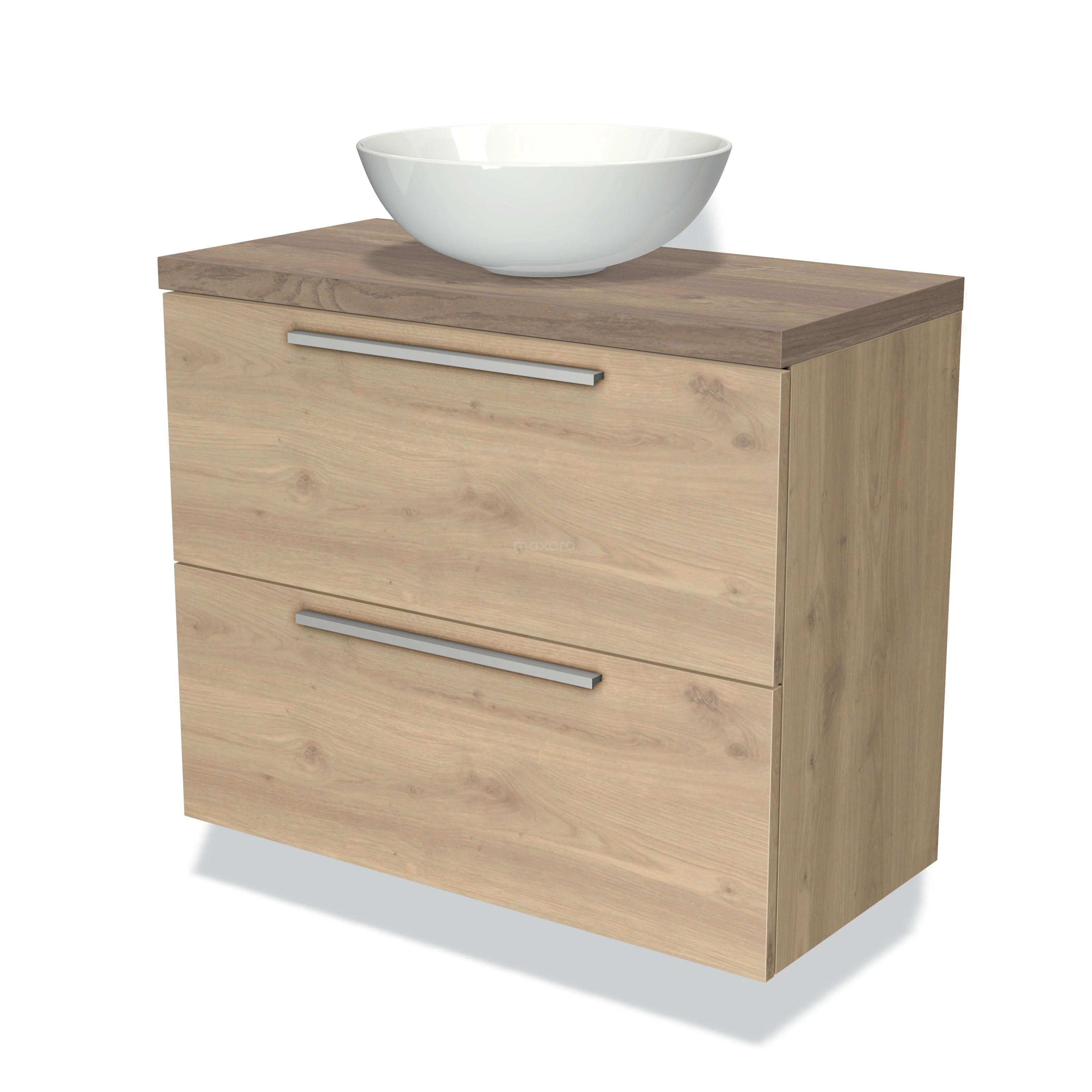 Modulo Plato Slim Badmöbel mit Aufsatzwaschbecken | 80 cm Hellbraune Eiche Flach front Mittelbraune Eiche blatt 2 übereinanderliegende Schubladen