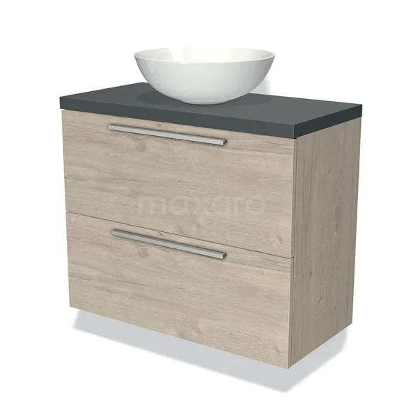 Modulo Plato Slim Badmöbel mit Aufsatzwaschbecken | 80 cm Hellgraue Eiche Flach front Dunkelgrau blatt 2 übereinanderliegende Schubladen