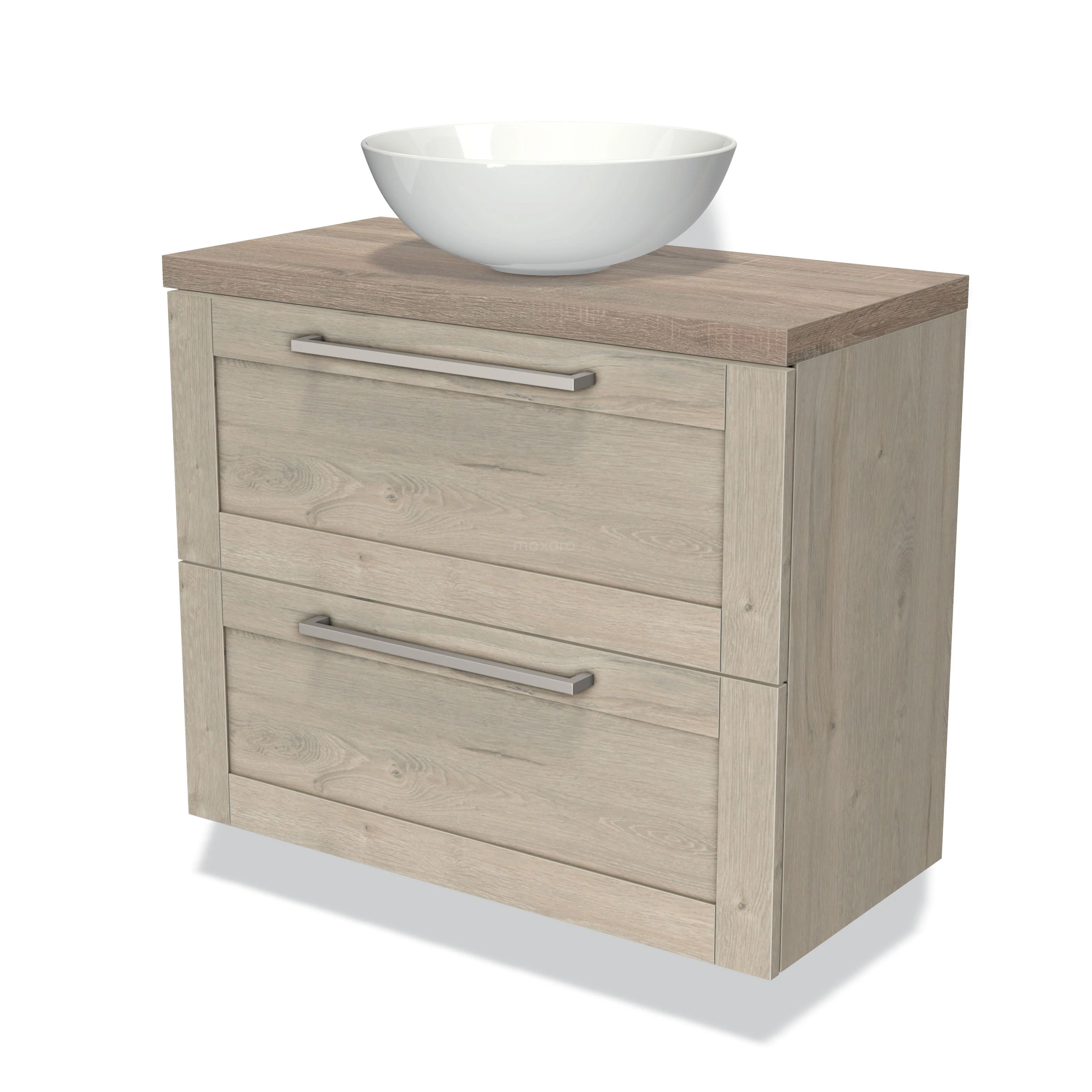 Modulo Plato Slim Badmöbel mit Aufsatzwaschbecken | 80 cm Hellgraue Eiche Rahmen front Eiche blatt 2 übereinanderliegende Schubladen