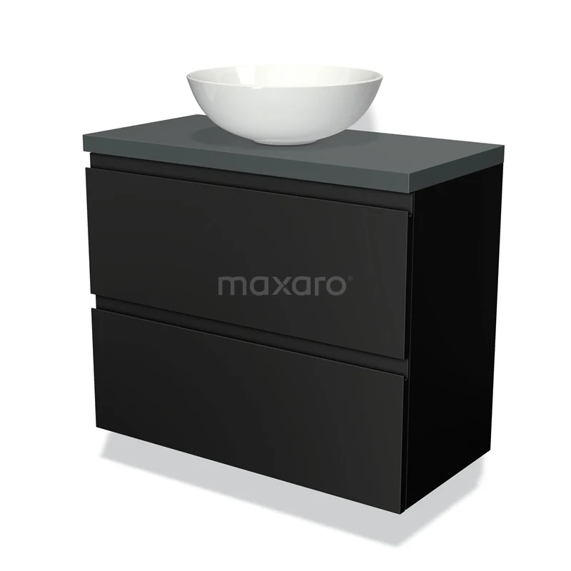 Modulo Plato Slim Badmöbel mit Aufsatzwaschbecken | 80 cm Matt Schwarz Grifflos front Dunkelgrau blatt 2 übereinanderliegende Schubladen