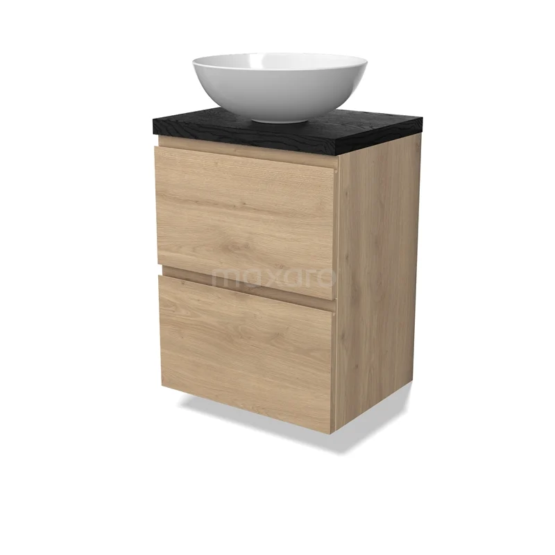 Modulo Plato Slim Badmöbel mit Aufsatzwaschbecken | 50 cm Hellbraune Eiche Grifflos front Schwarze Eiche blatt 2 übereinanderliegende Schubladen BMK37-02838