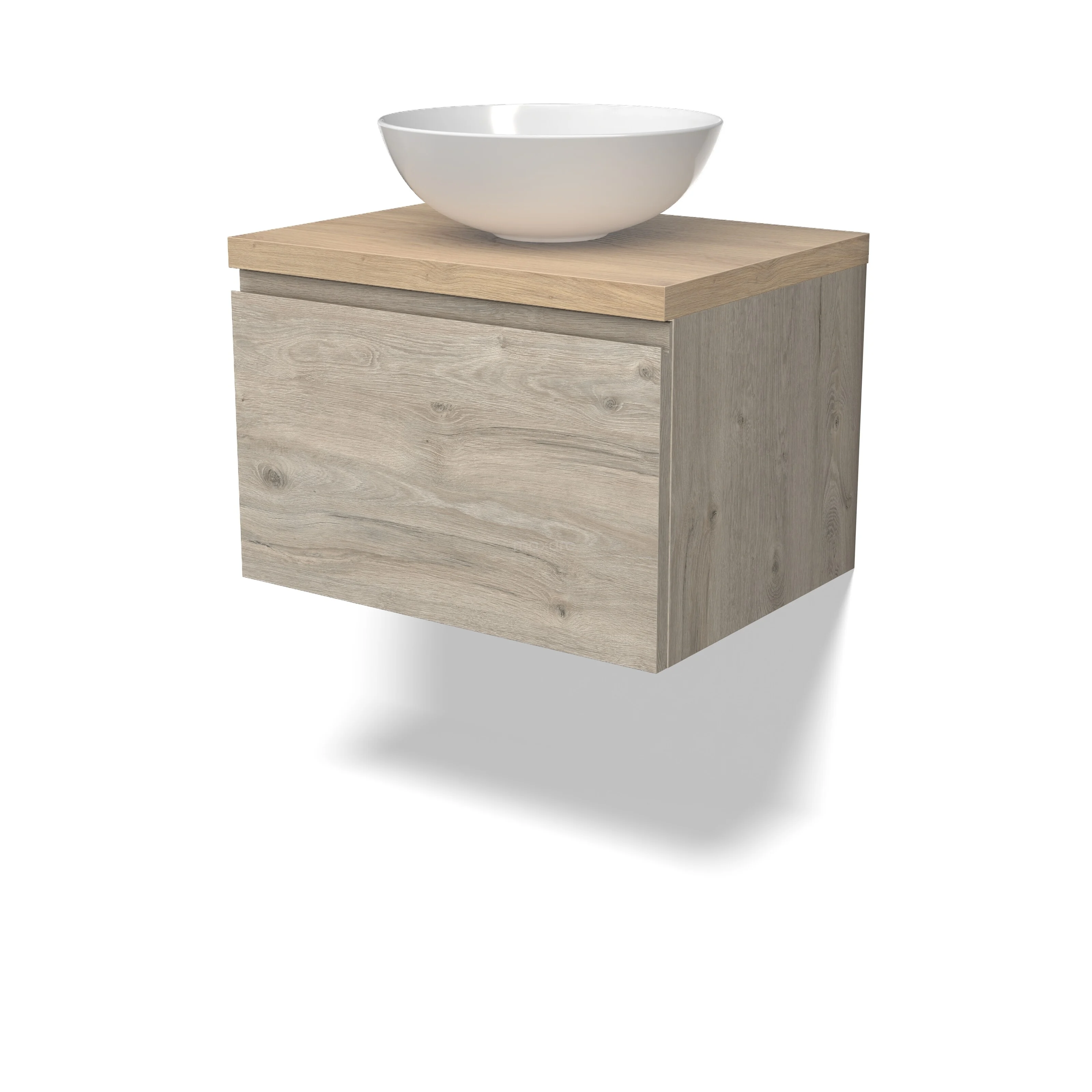 Modulo Plato Badmöbel mit Aufsatzwaschbecken | 60 cm Hellgraue Eiche Grifflos front Hellbraune Eiche blatt 1 Schublade