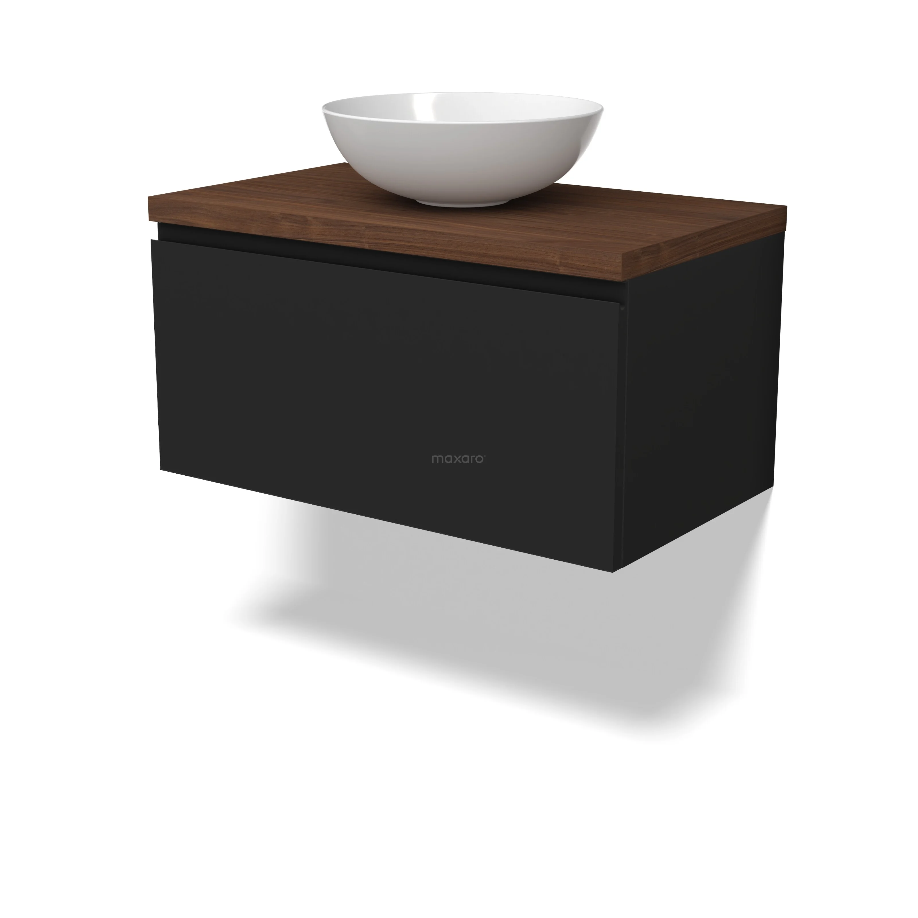 Modulo Plato Badmöbel mit Aufsatzwaschbecken | 80 cm Matt Schwarz Grifflos front Walnuss blatt 1 Schublade