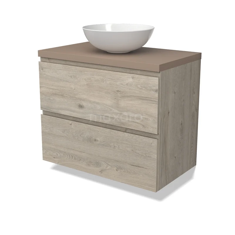 Modulo Plato Badmöbel mit Aufsatzwaschbecken | 80 cm Hellgraue Eiche Grifflos front Taupe blatt 2 übereinanderliegende Schubladen