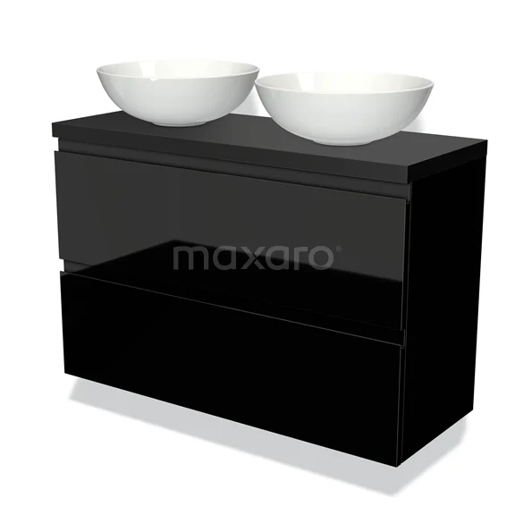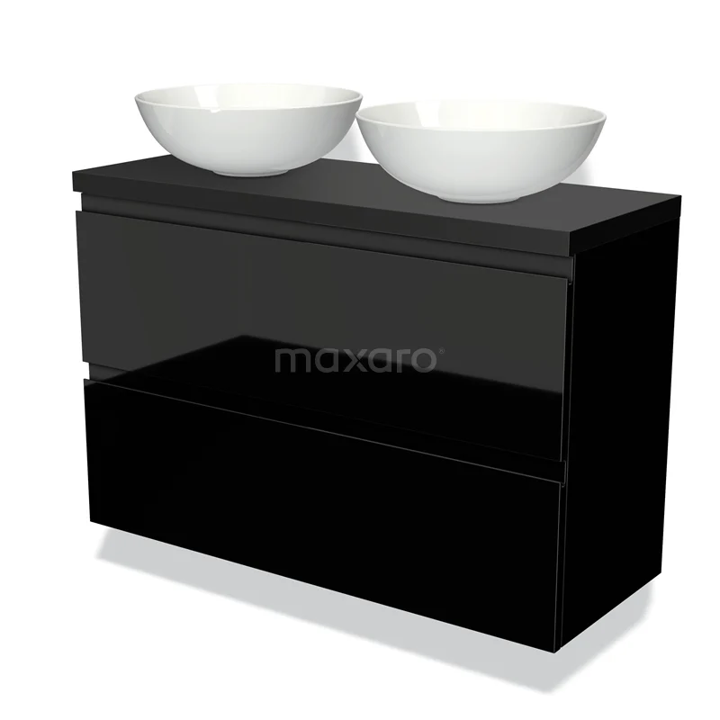 Modulo Plato Slim Badmöbel mit Aufsatzwaschbecken | 100 cm Hochglanz Schwarz Grifflos front Matt Schwarz blatt 2 übereinanderliegende Schubladen