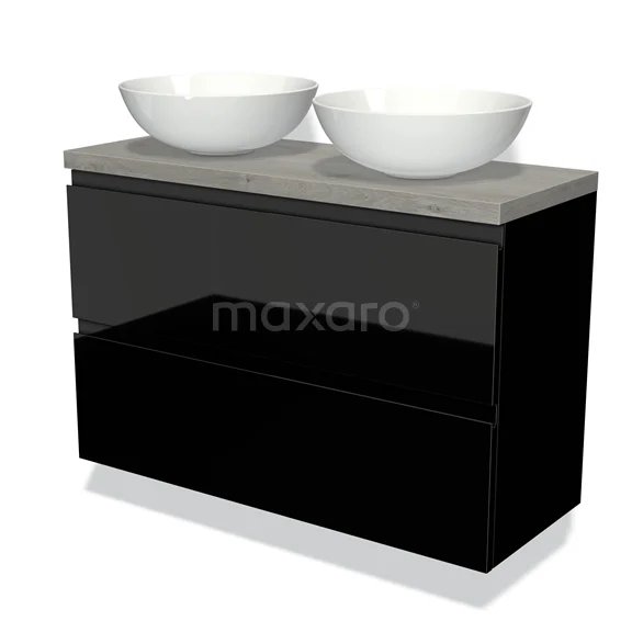 Modulo Plato Slim Badmöbel mit Aufsatzwaschbecken | 100 cm Hochglanz Schwarz Grifflos front Graue Eiche blatt 2 übereinanderliegende Schubladen