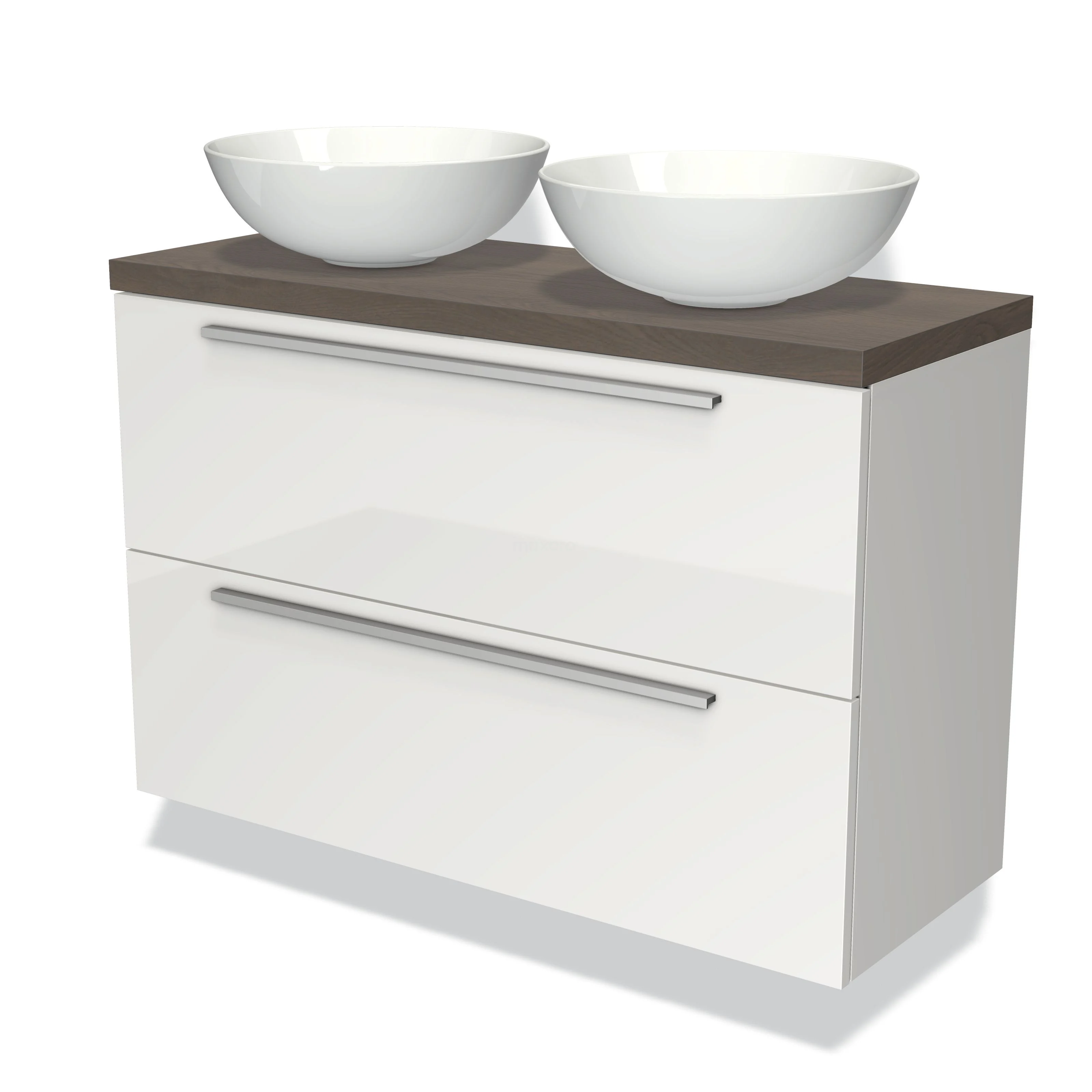Modulo Plato Slim Badmöbel mit Aufsatzwaschbecken | 100 cm Hochglanz Weiß Flach front Dunkelbraune Eiche blatt 2 übereinanderliegende Schubladen