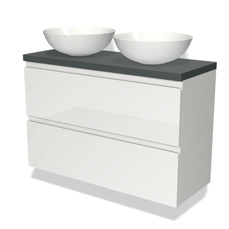 Modulo Plato Slim Badmöbel mit Aufsatzwaschbecken | 100 cm Hochglanz Weiß Grifflos front Dunkelgrau blatt 2 übereinanderliegende Schubladen