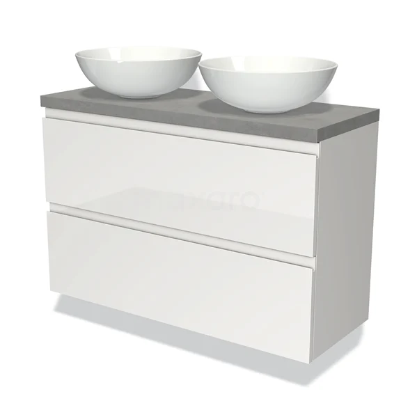 Modulo Plato Slim Badmöbel mit Aufsatzwaschbecken | 100 cm Hochglanz Weiß Grifflos front Hellgrauer Beton blatt 2 übereinanderliegende Schubladen