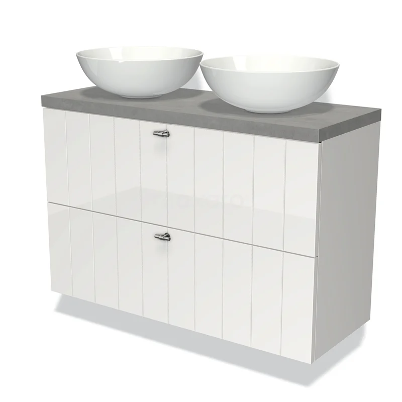 Modulo Plato Slim Badmöbel mit Aufsatzwaschbecken | 100 cm Hochglanz Weiß Lamelle front Hellgrauer Beton blatt 2 übereinanderliegende Schubladen