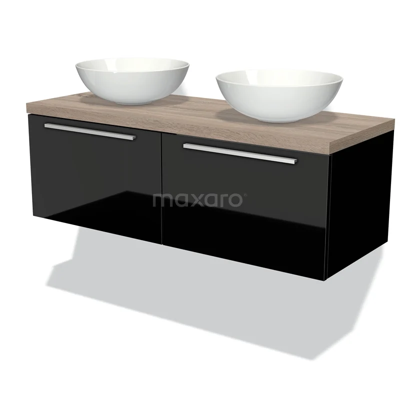 Waschtischunterschrank mit Konsole 120cm Modulo Plato Hochglanz Schwarz 2 Schubladen Flache Eiche Platte