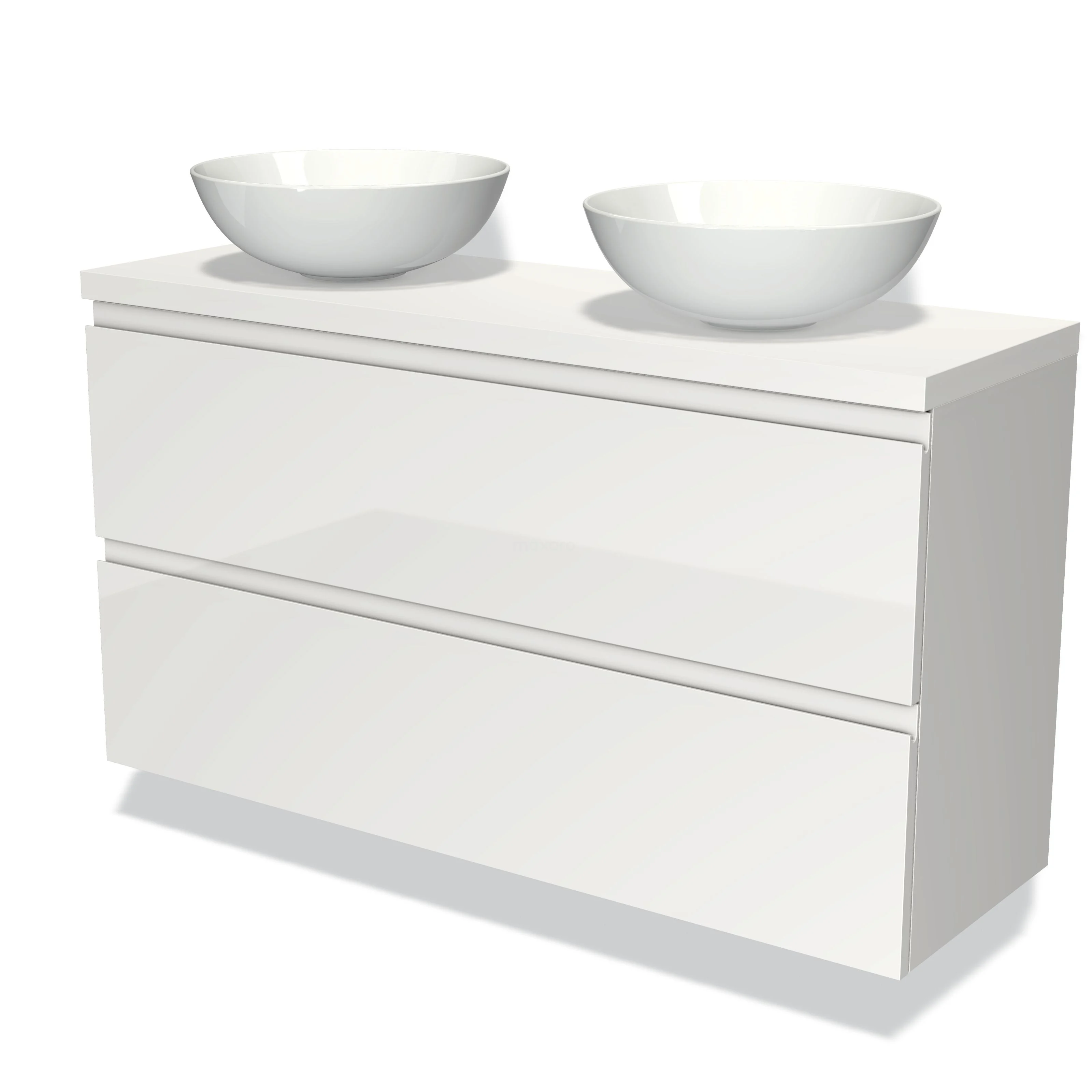 Modulo Plato Slim Badmöbel mit Aufsatzwaschbecken | 120 cm Hochglanz Weiß Grifflos front Matt Weiß blatt 2 übereinanderliegende Schubladen