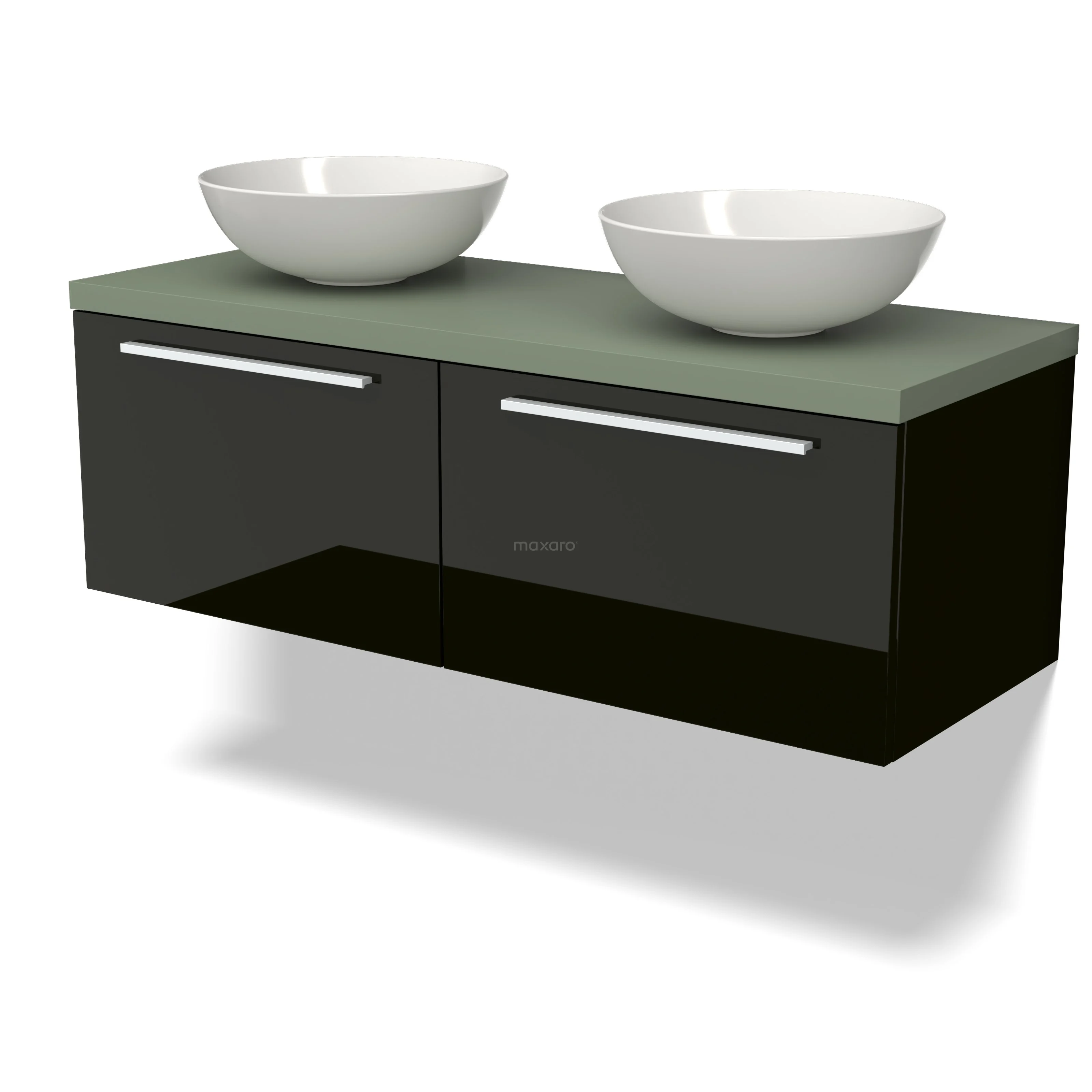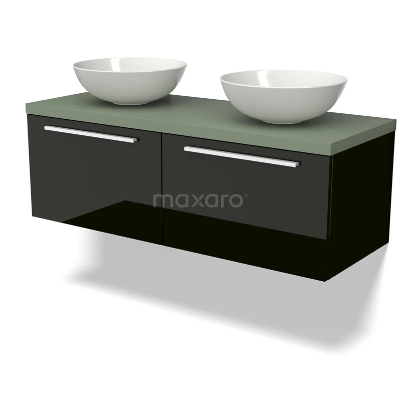 Modulo Plato Badmöbel mit Aufsatzwaschbecken | 120 cm Hochglanz Schwarz Flach front Salbeigrün blatt 2 nebeneinanderliegende Schubladen