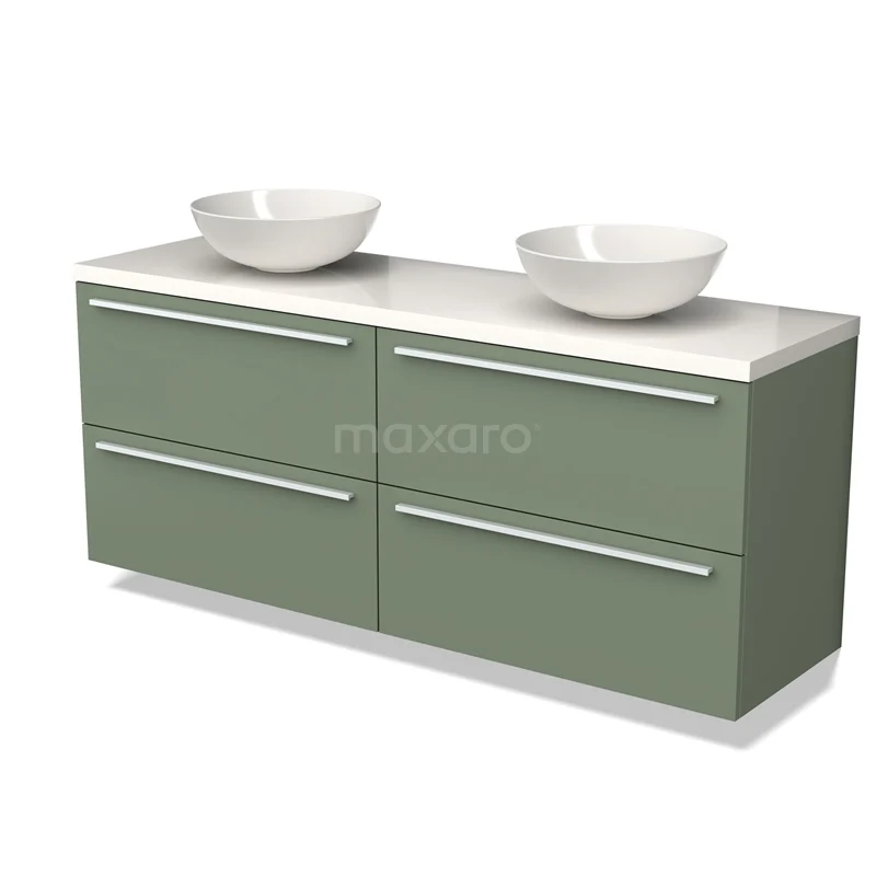 Modulo Plato Badmöbel mit Aufsatzwaschbecken | 160 cm Salbeigrün Flach front Hochglanz Weiß blatt 4 Schubladen
