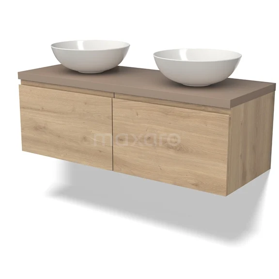 Modulo Plato Badmöbel mit Aufsatzwaschbecken | 120 cm Hellbraune Eiche Grifflos front Taupe blatt 2 nebeneinanderliegende Schubladen