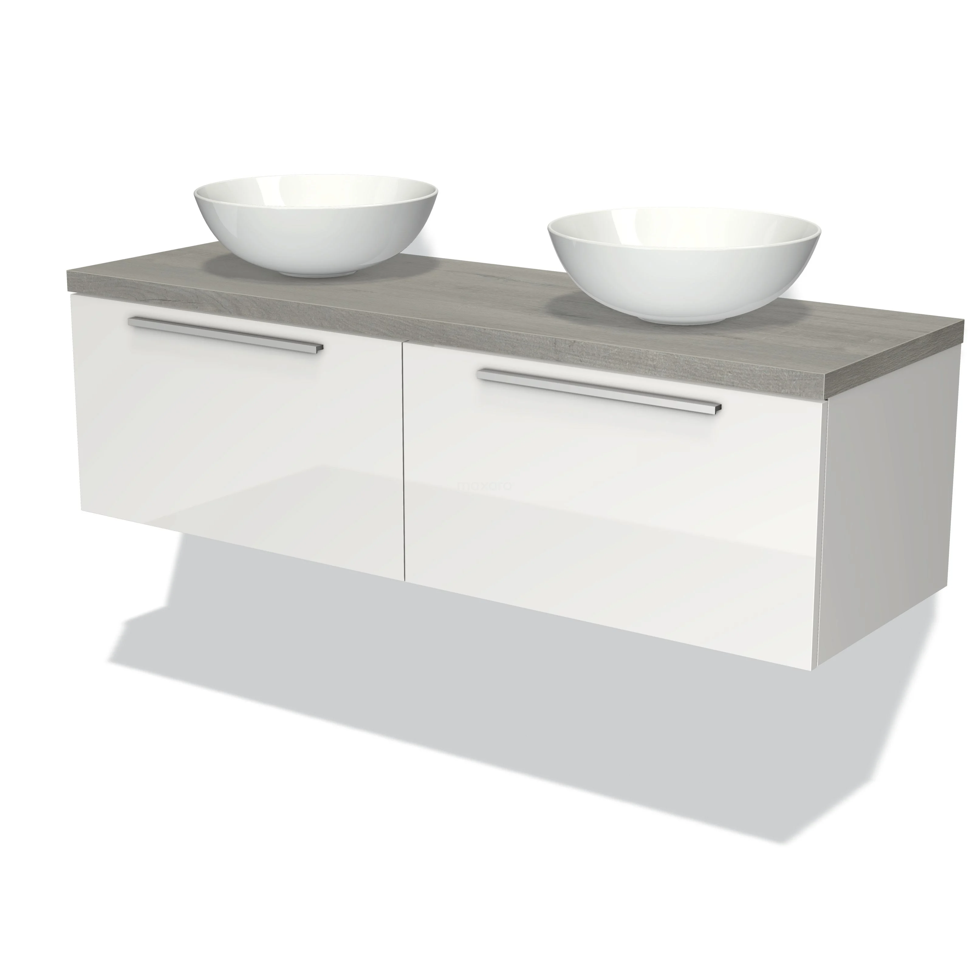 Waschtischunterschrank mit Konsole 140cm Modulo Plato Hochglanz Weiß 2 Schubladen Flach Graue Eiche Platte