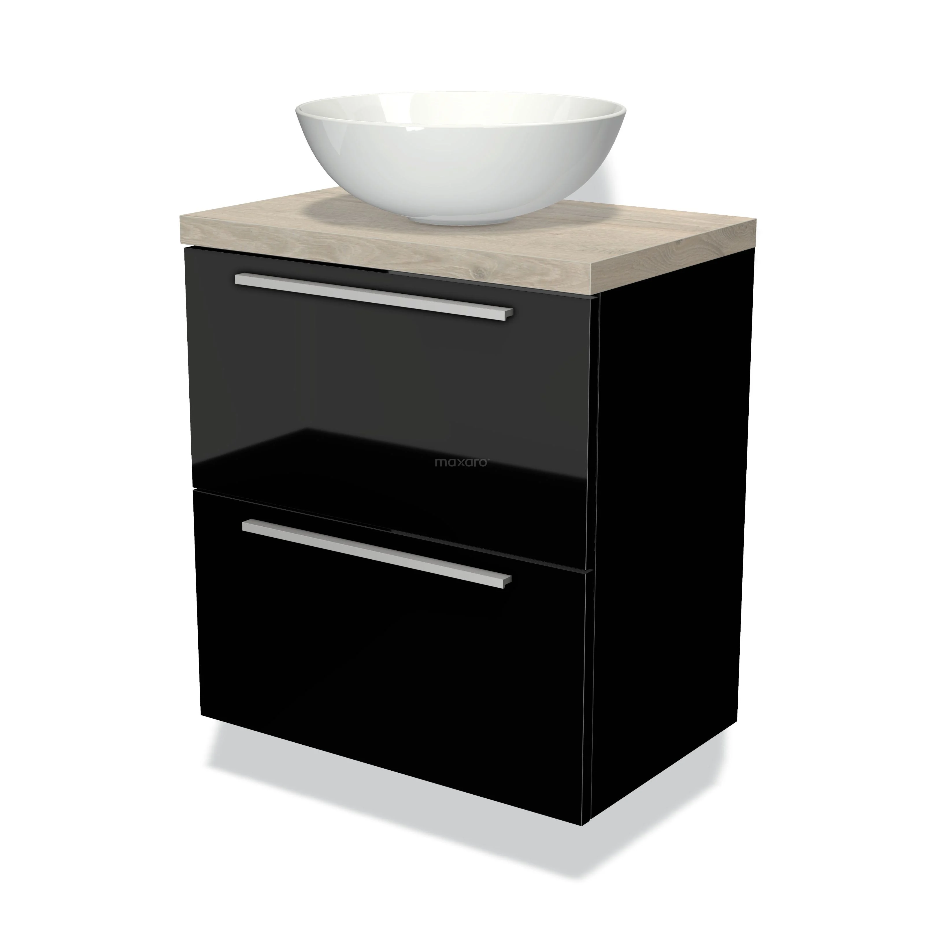 Modulo Plato Slim Badmöbel mit Aufsatzwaschbecken | 60 cm Hochglanz Schwarz Flach front Hellgraue Eiche blatt 2 übereinanderliegende Schubladen