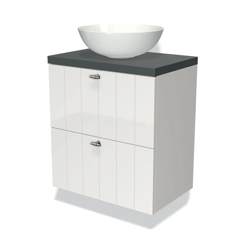 Modulo Plato Slim Badmöbel mit Aufsatzwaschbecken | 60 cm Hochglanz Weiß Lamelle front Dunkelgrau blatt 2 übereinanderliegende Schubladen