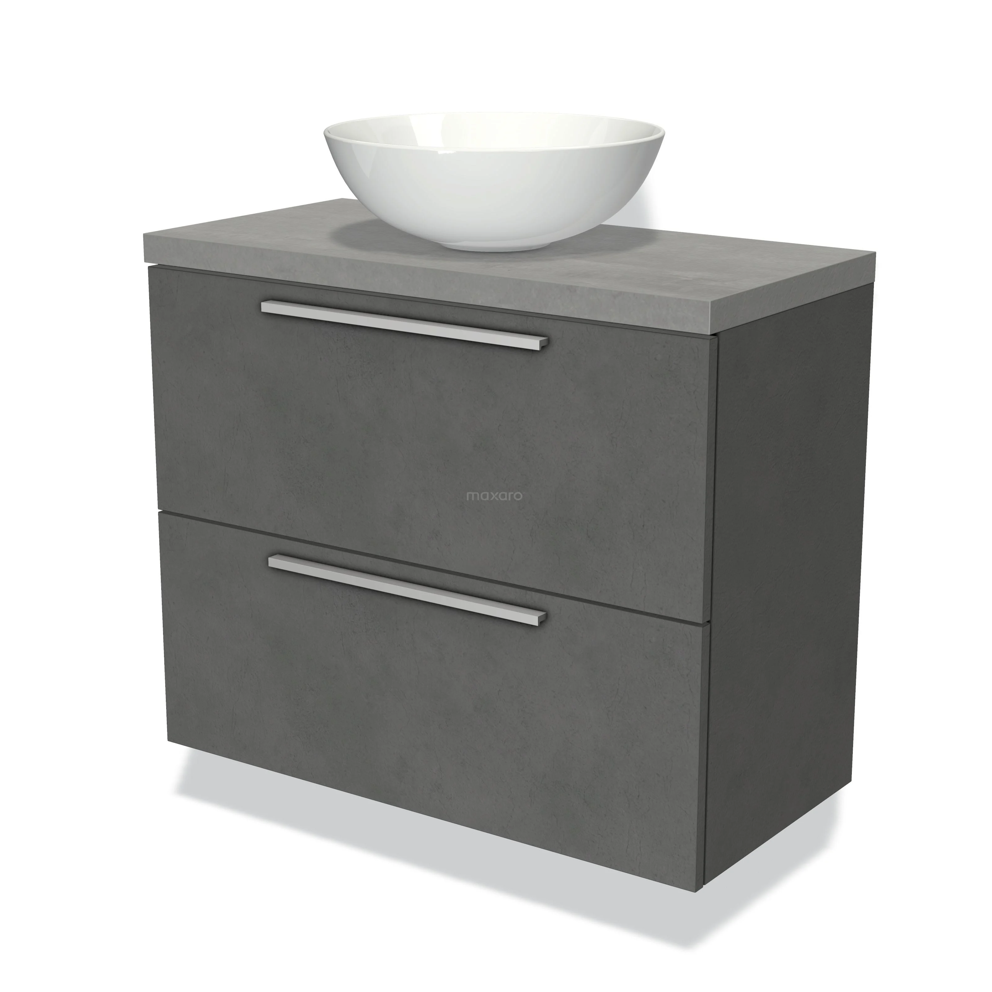 Modulo Plato Slim Badmöbel mit Aufsatzwaschbecken | 80 cm Dunkelgrauer Beton Flach front Hellgrauer Beton blatt 2 übereinanderliegende Schubladen