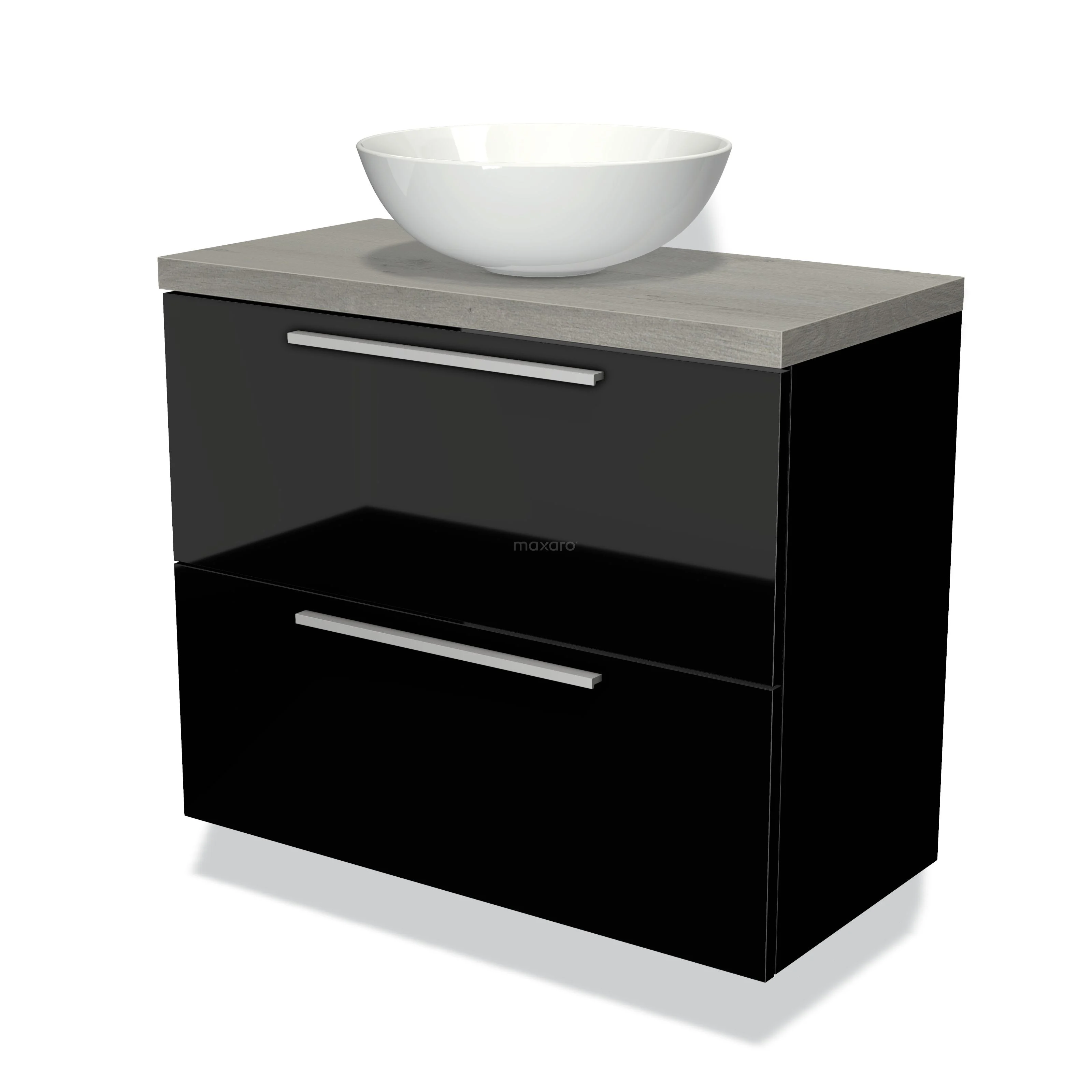 Modulo Plato Slim Badmöbel mit Aufsatzwaschbecken | 80 cm Hochglanz Schwarz Flach front Graue Eiche blatt 2 übereinanderliegende Schubladen