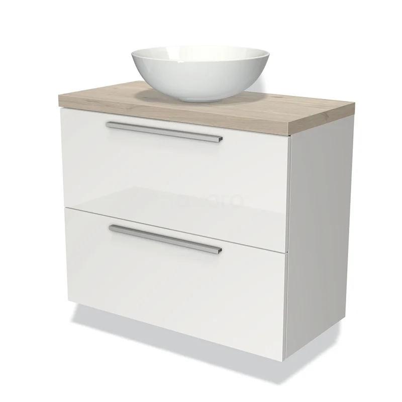 Modulo Plato Slim Badmöbel mit Aufsatzwaschbecken | 80 cm Hochglanz Weiß Flach front Hellgraue Eiche blatt 2 übereinanderliegende Schubladen