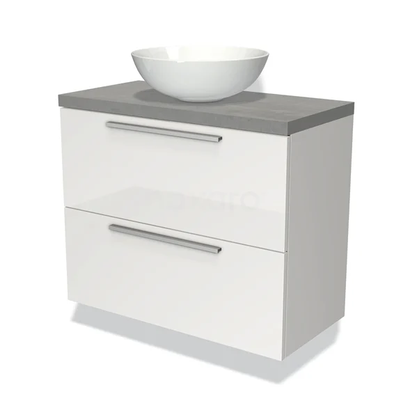 Modulo Plato Slim Badmöbel mit Aufsatzwaschbecken | 80 cm Hochglanz Weiß Flach front Hellgrauer Beton blatt 2 übereinanderliegende Schubladen