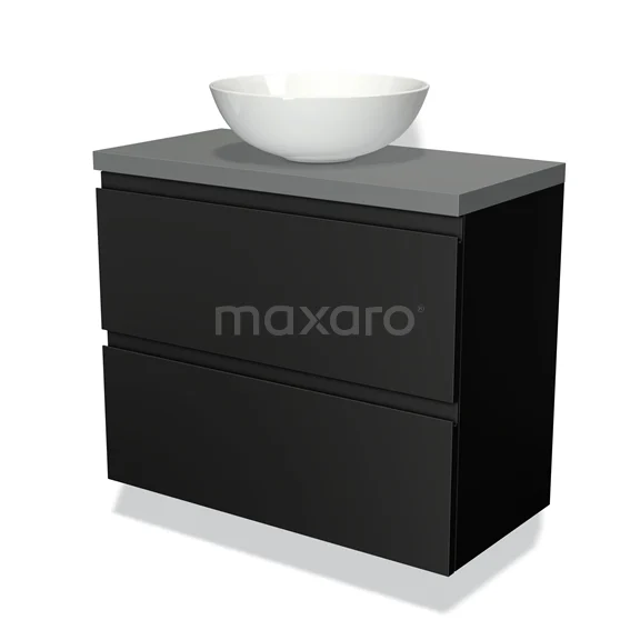 Modulo Plato Slim Badmöbel mit Aufsatzwaschbecken | 80 cm Matt Schwarz Grifflos front Mittelgrau blatt 2 übereinanderliegende Schubladen