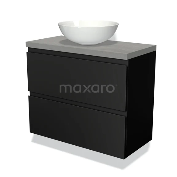 Modulo Plato Slim Badmöbel mit Aufsatzwaschbecken | 80 cm Matt Schwarz Grifflos front Hellgrauer Beton blatt 2 übereinanderliegende Schubladen
