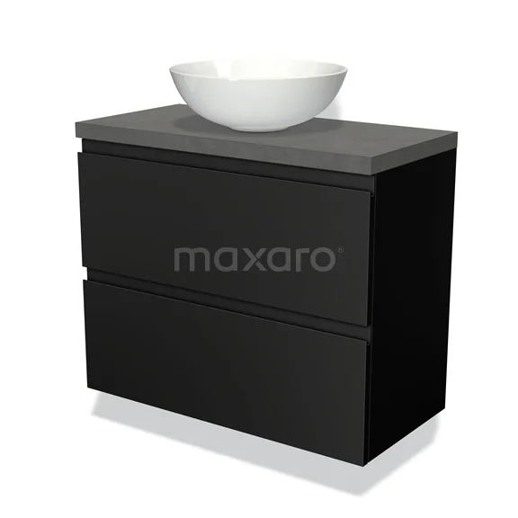Modulo Plato Slim Badmöbel mit Aufsatzwaschbecken | 80 cm Matt Schwarz Grifflos front Dunkelgrauer Beton blatt 2 übereinanderliegende Schubladen