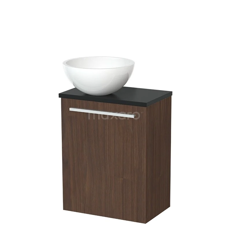 Wandunterbau Holzoptik mit schwarzer Platte und weißem rundem keramischen Aufsatzwaschbecken-Design, perfekte Lösung für ein stilvolles Badezimmer.