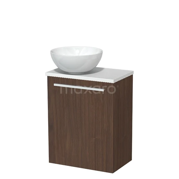 Holz-Badmöbel mit weißem Aufsatzwaschbecken, minimalistisches Design, ideal für eine moderne Badezimmergestaltung.