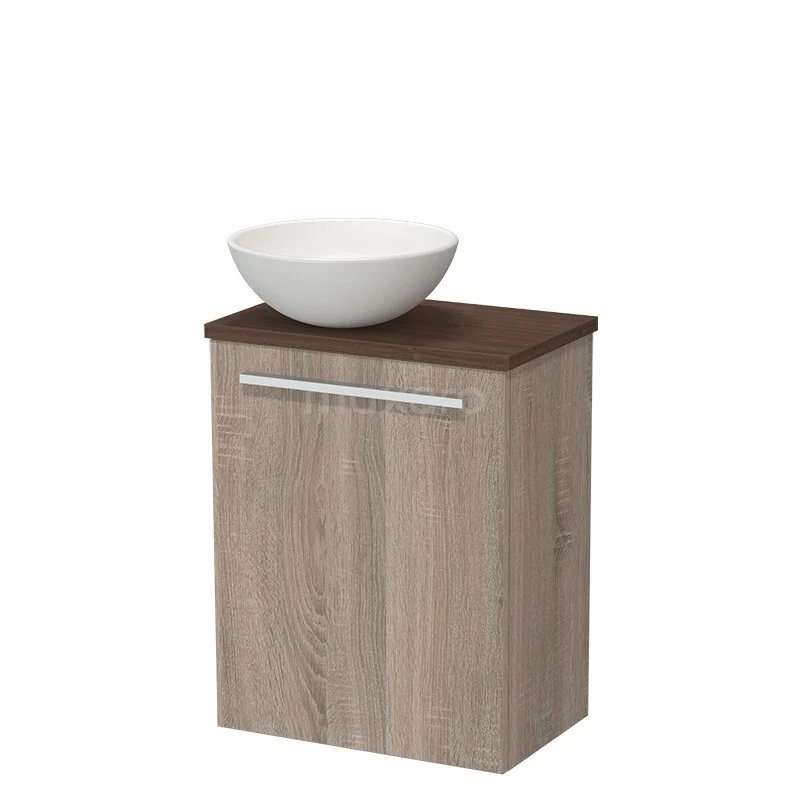 Holz-Badschrank mit weißem Aufsatzwaschbecken, kompaktes Design und minimalistischer silberner Griff, ideal für moderne Bäder.