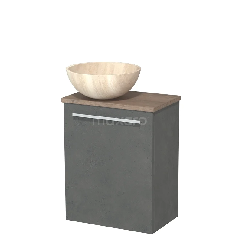 WC-Möbel mit Aufsatzwaschbecken | 41 cm Dunkelgrauer Beton Glatte Front Travertin Naturstein Aufsatzwaschbecken Mittelbraune Eiche Platte