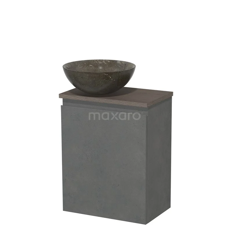 WC-Möbel mit Aufsatzwaschbecken | 41 cm Dunkelgrauer Beton Grifflose Front Blaustein Naturstein Aufsatzwaschbecken Dunkelbraune Eiche Platte