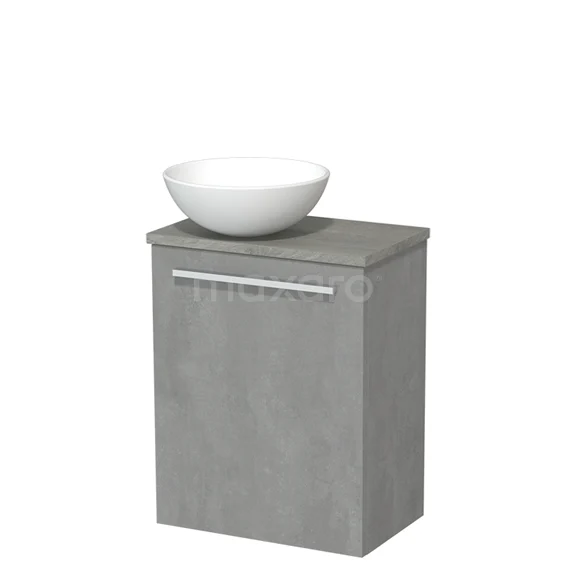 Grauer Badschrank mit Waschbecken, modernes Design, Betonlook, klare Linien, einschließlich weißem Aufsatzwaschbecken.