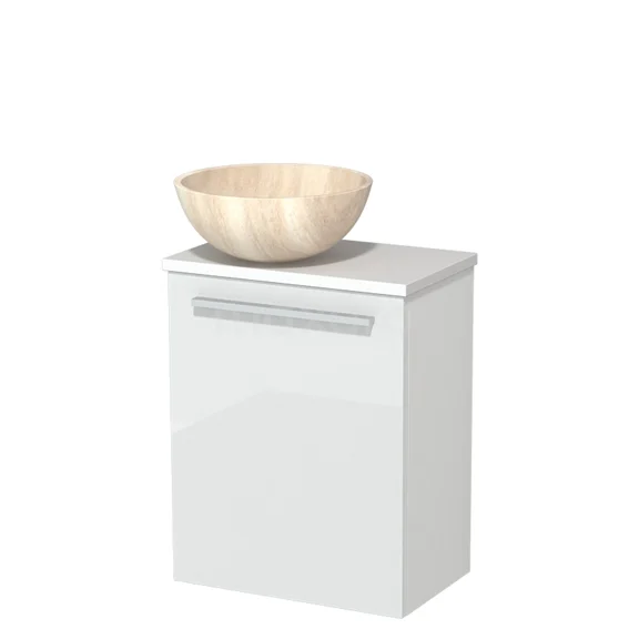 WC-Möbel mit Aufsatzwaschbecken | 41 cm Hochglanz Weiß Glatte Front Travertin Naturstein-Aufsatzwaschbecken Matt Weiß Platte