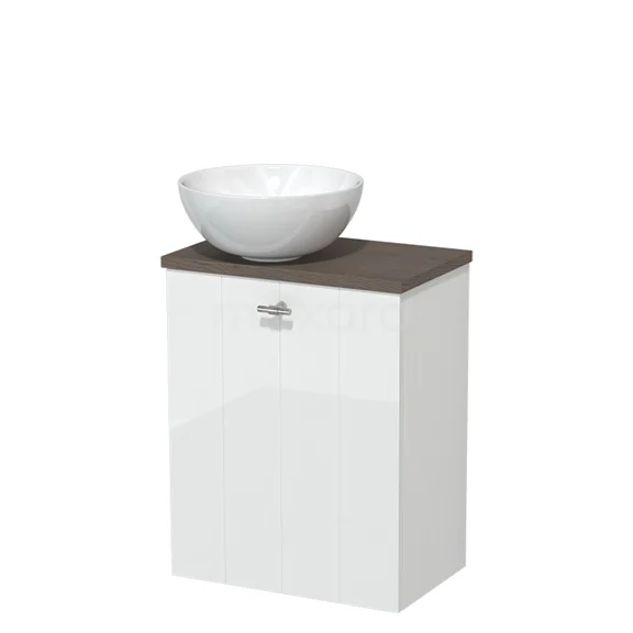WC-Möbel mit Aufsatzwaschbecken | 41 cm Hochglanz Weiß Lamellenfront Hochglanz Weiß Keramik Aufsatzwaschbecken Dunkelbraune Eiche Platte