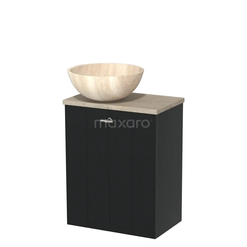 WC-Möbel mit Aufsatzwaschbecken | 41 cm Matt Schwarz Lamellen Front Travertin Naturstein Aufsatzwaschbecken Hellgraue Eiche Platte