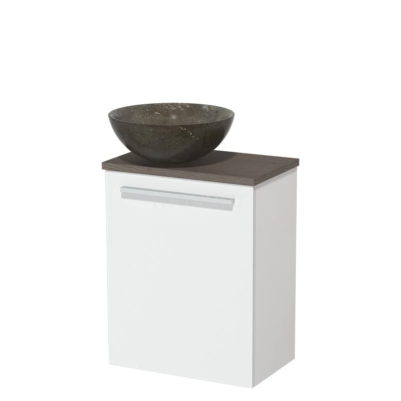 WC-Möbel mit Aufsatzwaschbecken | 41 cm Matt Weiß Glatte Front Blaustein Naturstein Aufsatzwaschbecken Dunkelbraune Eiche