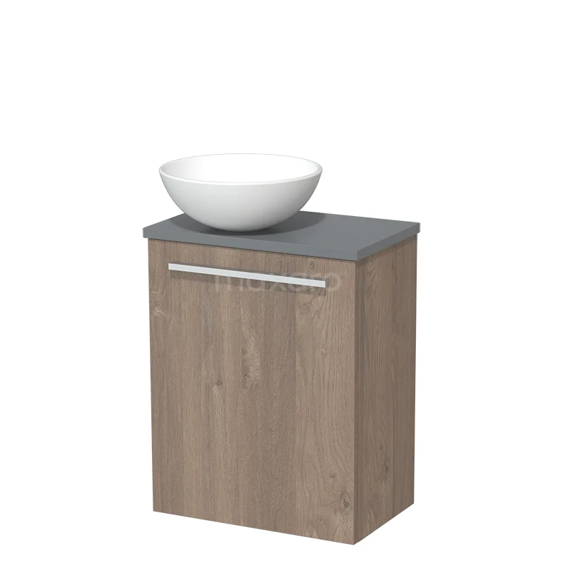 WC-Möbel mit Aufsatzwaschbecken | 41 cm Mittelbraune Eiche Glatte Front Matt Weiß Keramik Aufsatzwaschbecken Mittelgrau Platte