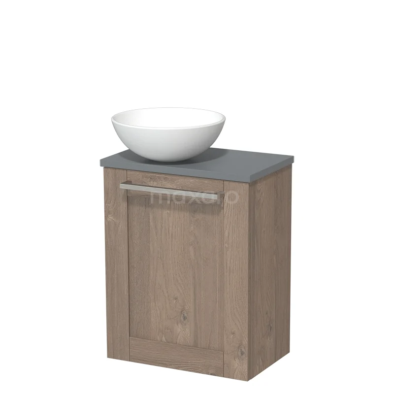 WC-Möbel mit Aufsatzwaschbecken | 41 cm Mittelbraune Eiche Rahmenfront Matt Weiß Keramik-Aufsatzwaschbecken Mittelgrau Platte