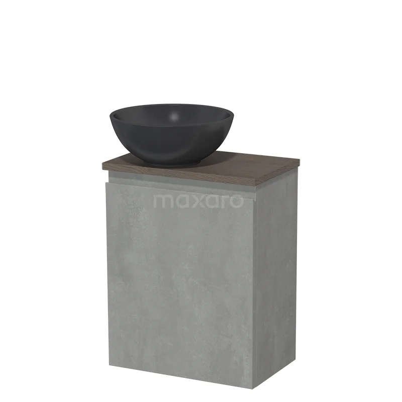 WC-Möbel mit Waschbecken | 41 cm Hellgrauer Beton Grifflose Front Matt Schwarz Quarz Aufsatzwaschbecken Dunkelbraune Eiche Platte