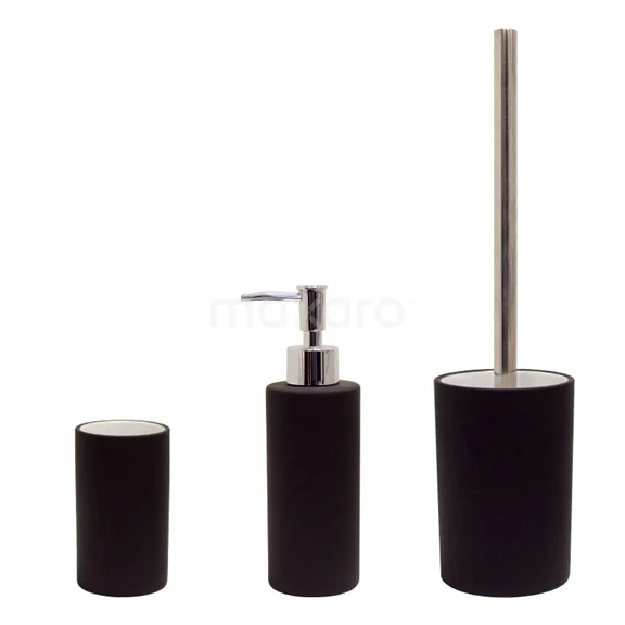 Das Zubehörset Solid stattet Ihr Badezimmer mit Zubehör aus, das gut zusammenpasst. Dieses Set besteht aus einem Zahnbürstenhalter, einem Seifenspender und einem Toilettenbürstenhalter. Das Zubehör hat ein rundes Design und eine schwarze Oberfläche mit weißer Innenseite. Dieses Zubehörset ist nicht nur funktional, sondern auch eine stilvolle Ergänzung für Ihr Badezimmer.