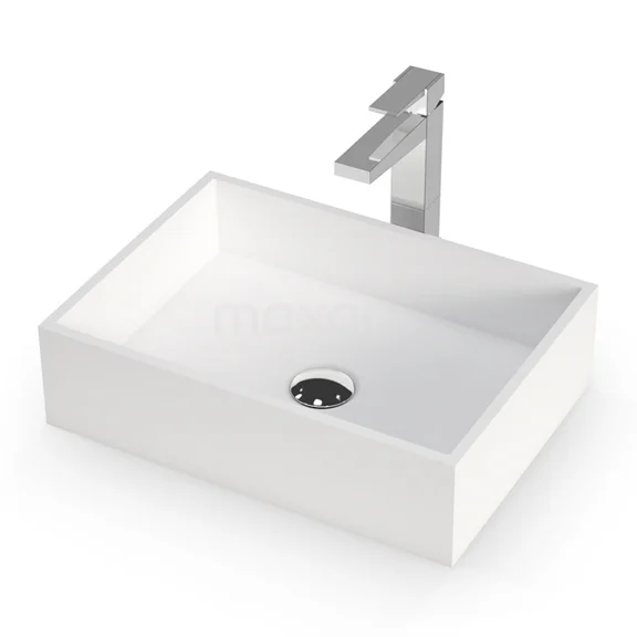 With this countertop wash basin from the Mintra Series, you will provide your bathroom with a chic look. The countertop wash basin is made of solid surface. This material is known for its soft and matt look. It gives the room a special touch. Experience the ultimate ease of maintenance, as scratches and stains can easily be removed with a scouring cream or light sandpaper. Furthermore, this model has a sleek, rectangular design.