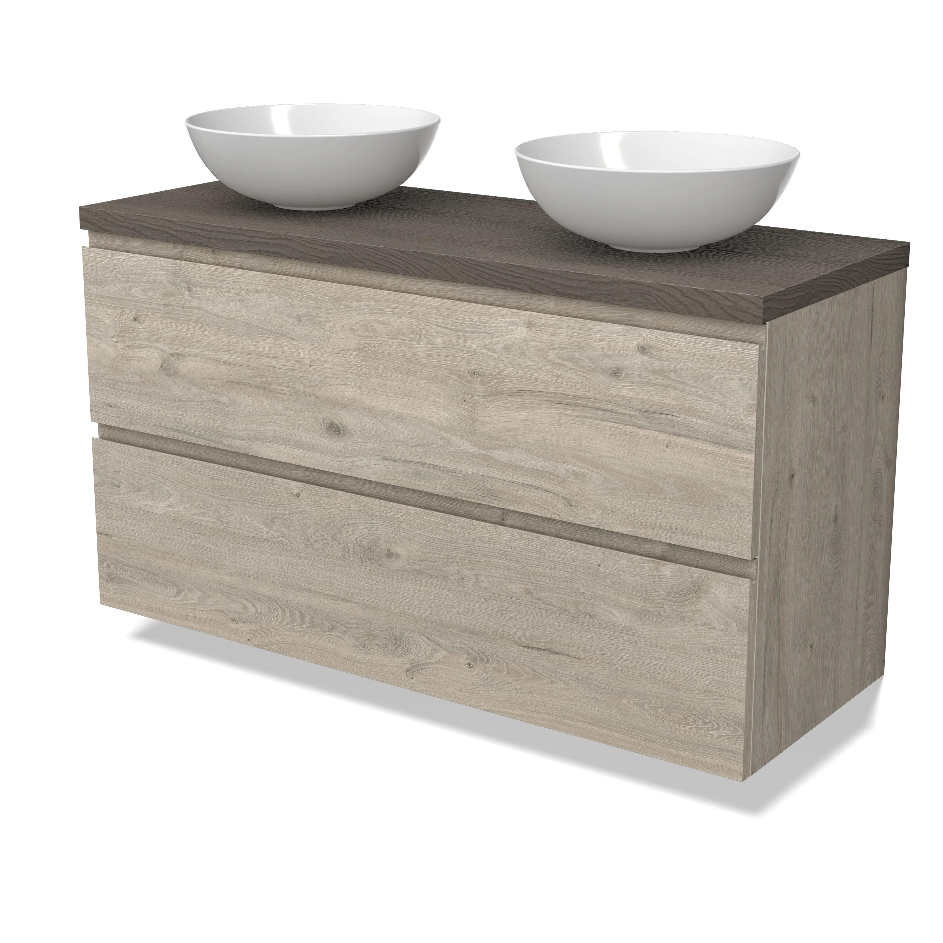 Modulo Plato Vanity units for countertop basin | 120 cm Light grey oak Handle-less front Dark brown oak worktop 2 Stacked drawers