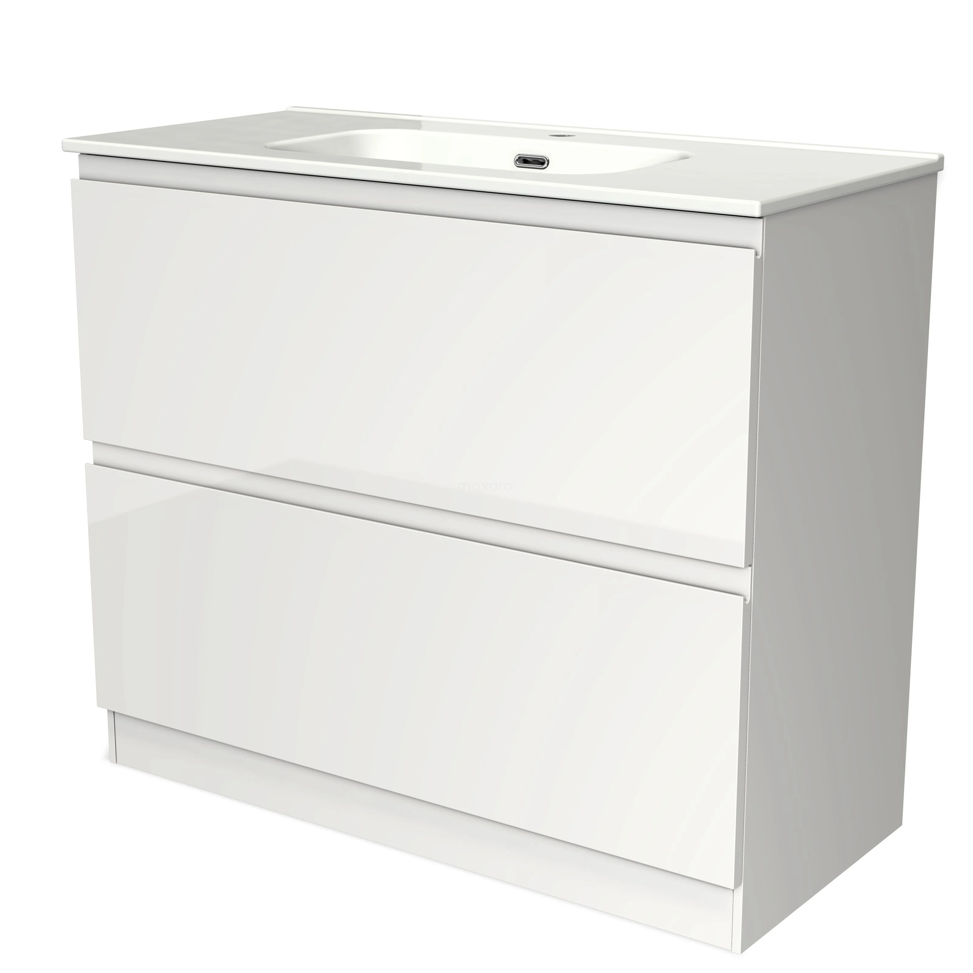 Modulo Bathroom furniture with sink | 100 cm High-gloss white Handle-less front Ceramic 2 high drawers standing drawers under each other