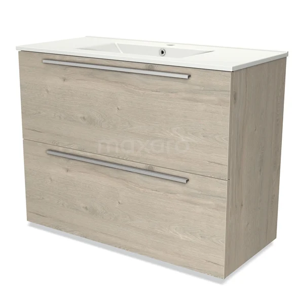 Modulo Bathroom furniture with sink | 100 cm Light grey oak Flat front Ceramic 2 stacked drawers under each other