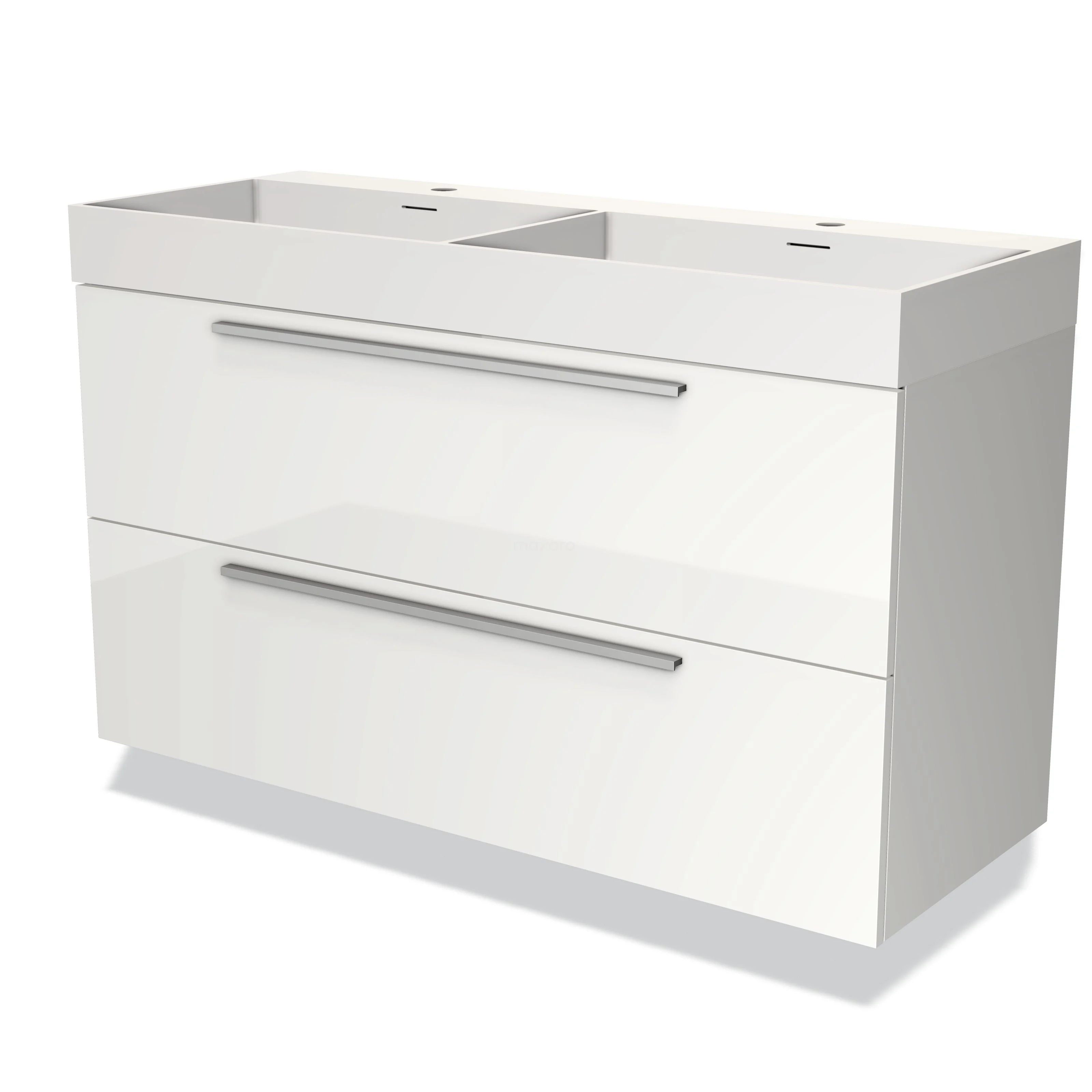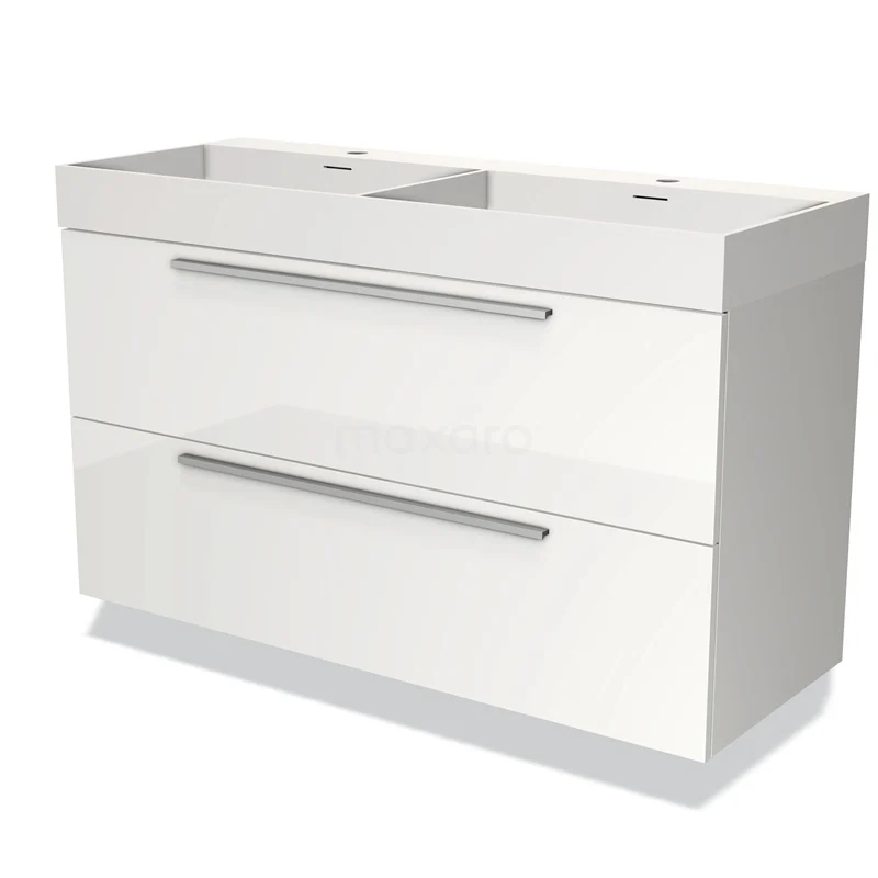 White double basin with two wide drawers, glossy finish and sleek design, perfect for modern bathrooms.