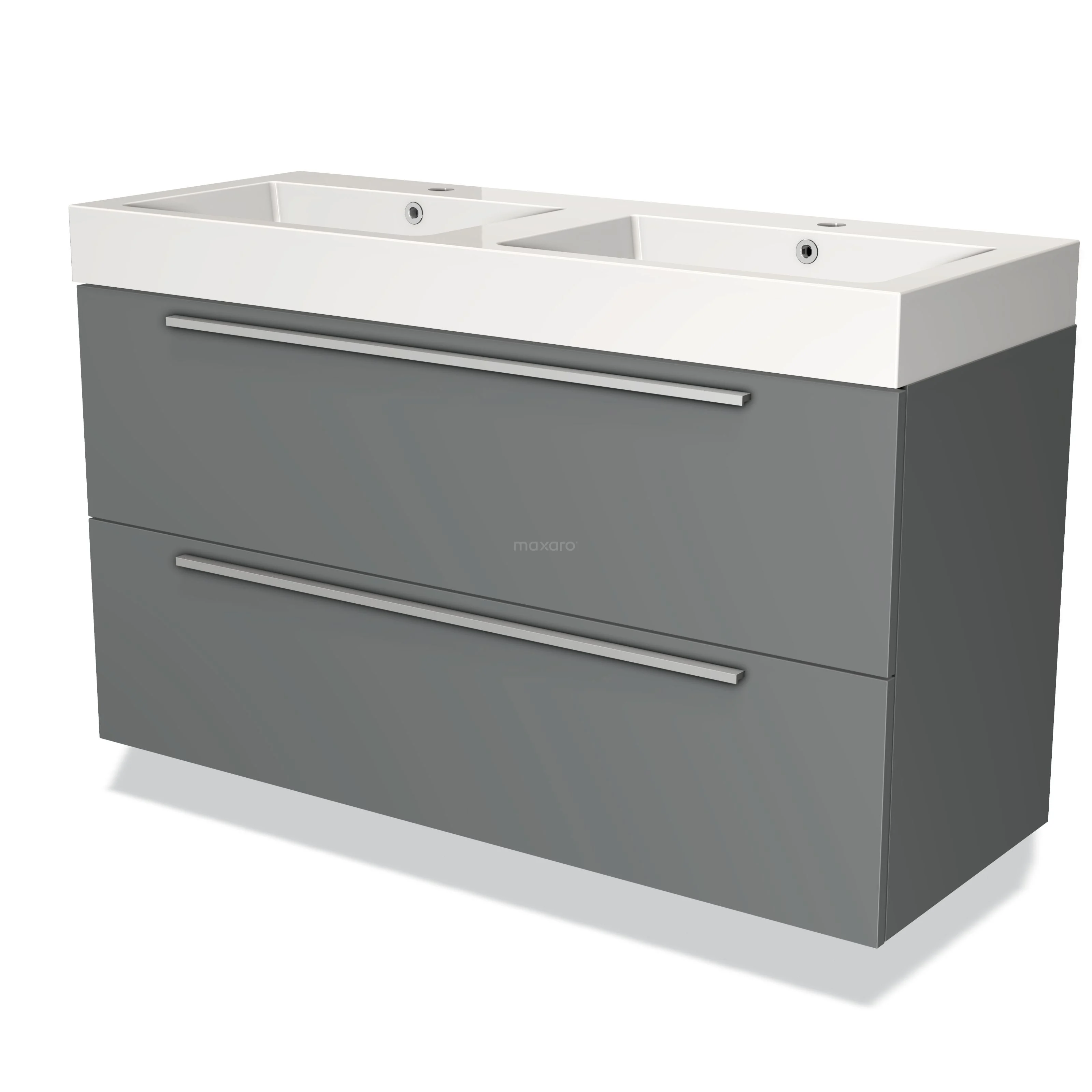 Grey ceramic double basin with drawer unit, sleek metal handles, ideal for modern bathrooms.