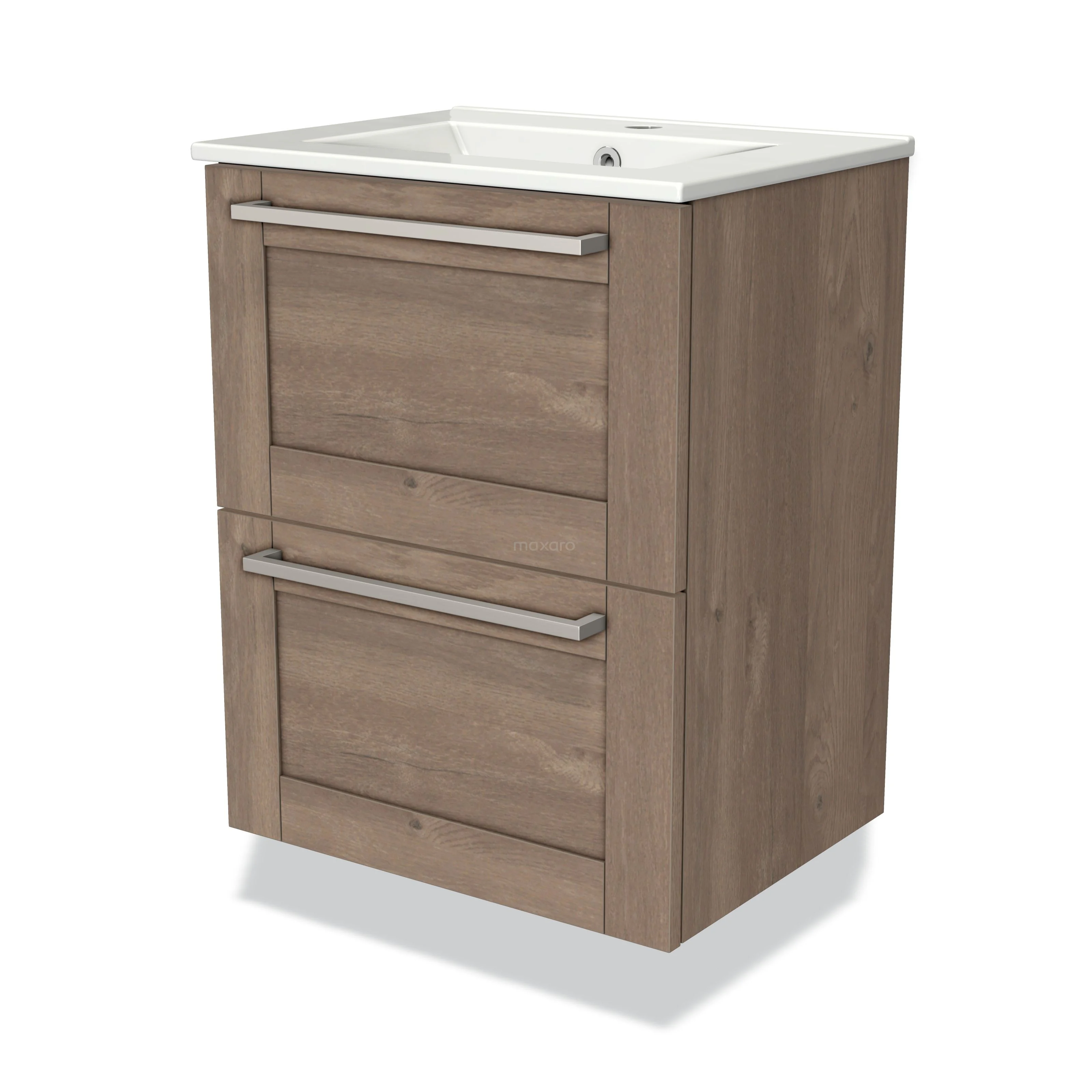 Stylish design The stylish design makes this bathroom unit the eye-catcher of your bathroom. The base cabinet features a framed front and has a mid brown oak finish. This beautiful oak look creates a warm atmosphere in your bathroom interior. In addition, the framed front adds a classic touch. You will need to joint the handles yourself. These are available in different colours and shapes.